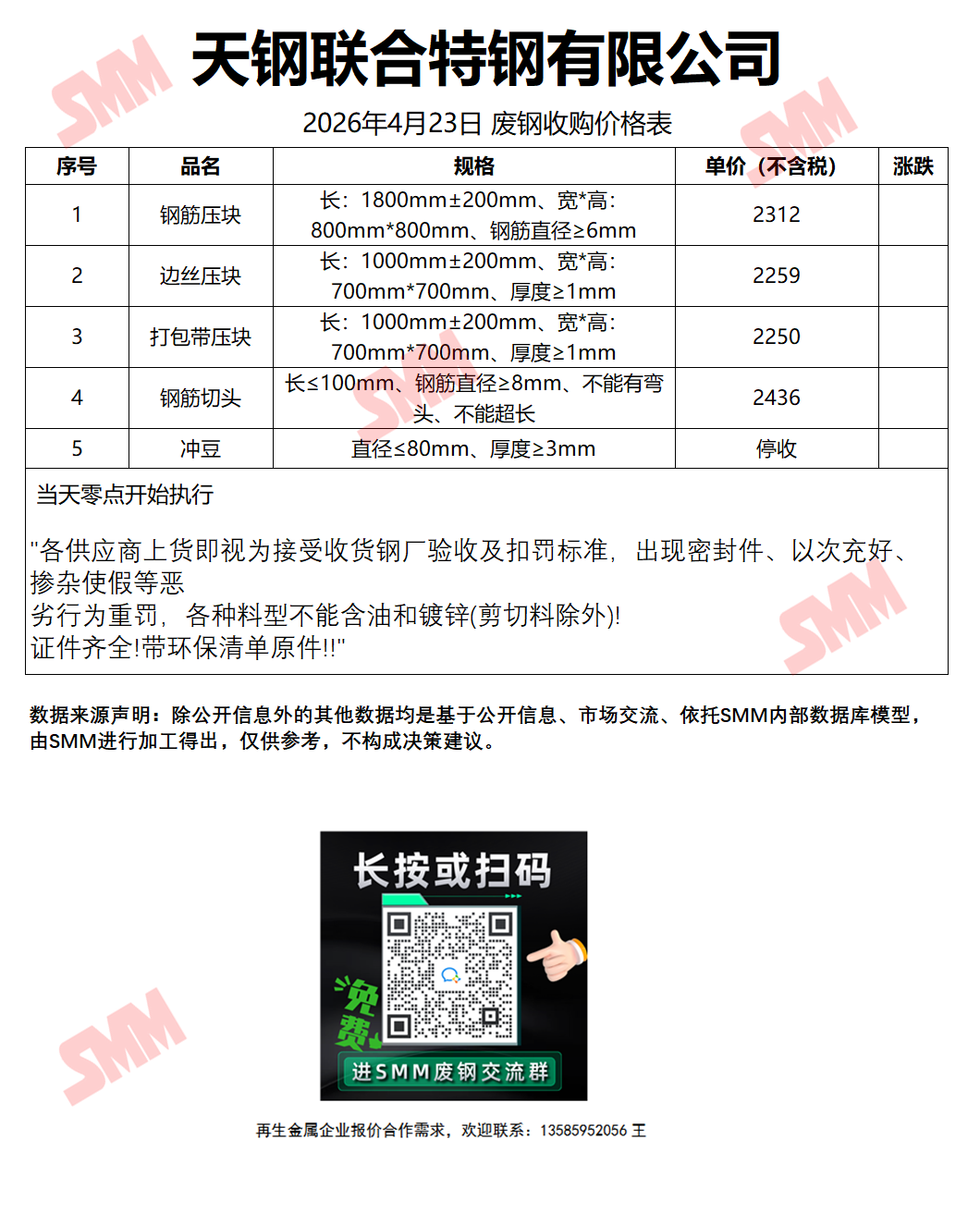 4月23日敬业钢铁(孟耳庄园区) 废钢采购报价