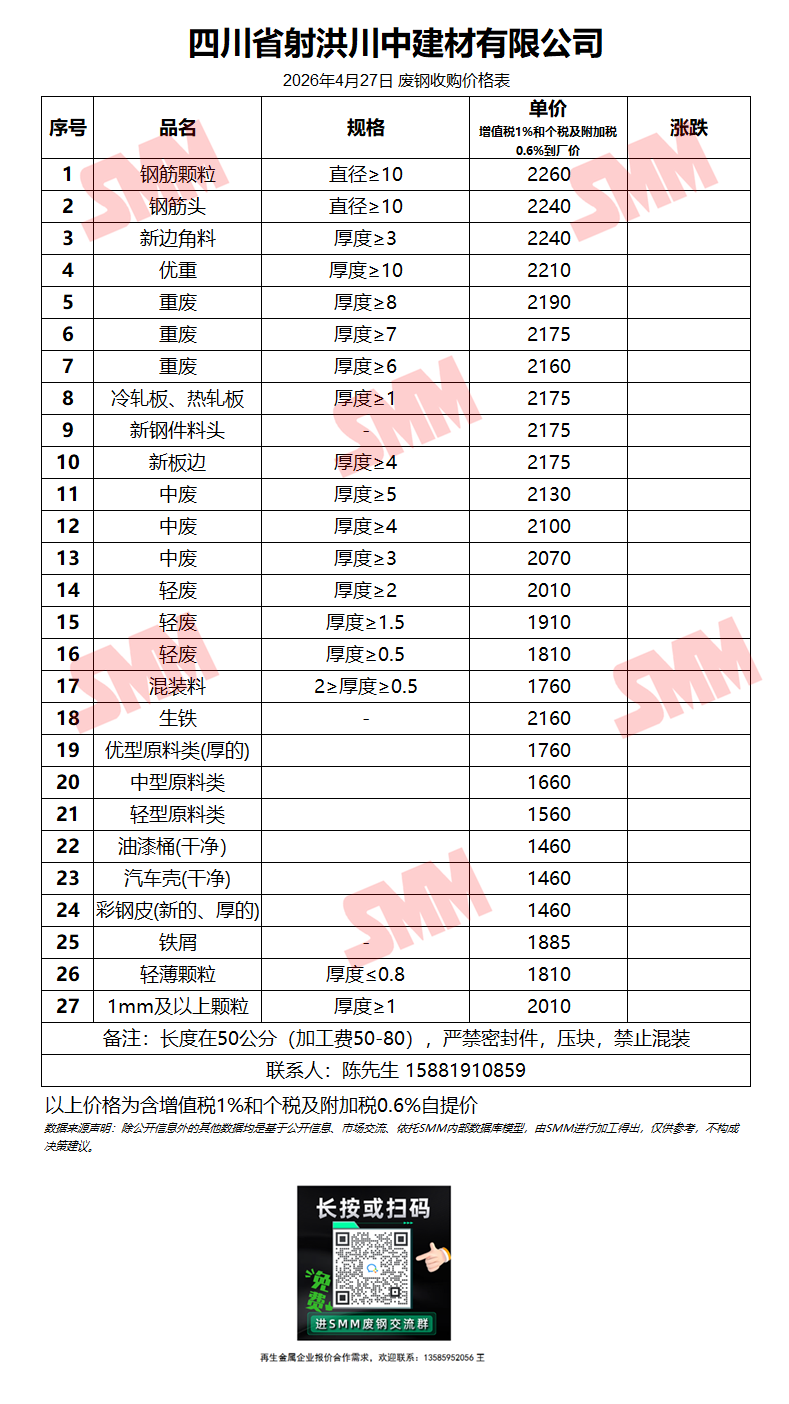 4月27日鑫泉钢铁(原绵竹金泉钢铁) 废钢采购报价