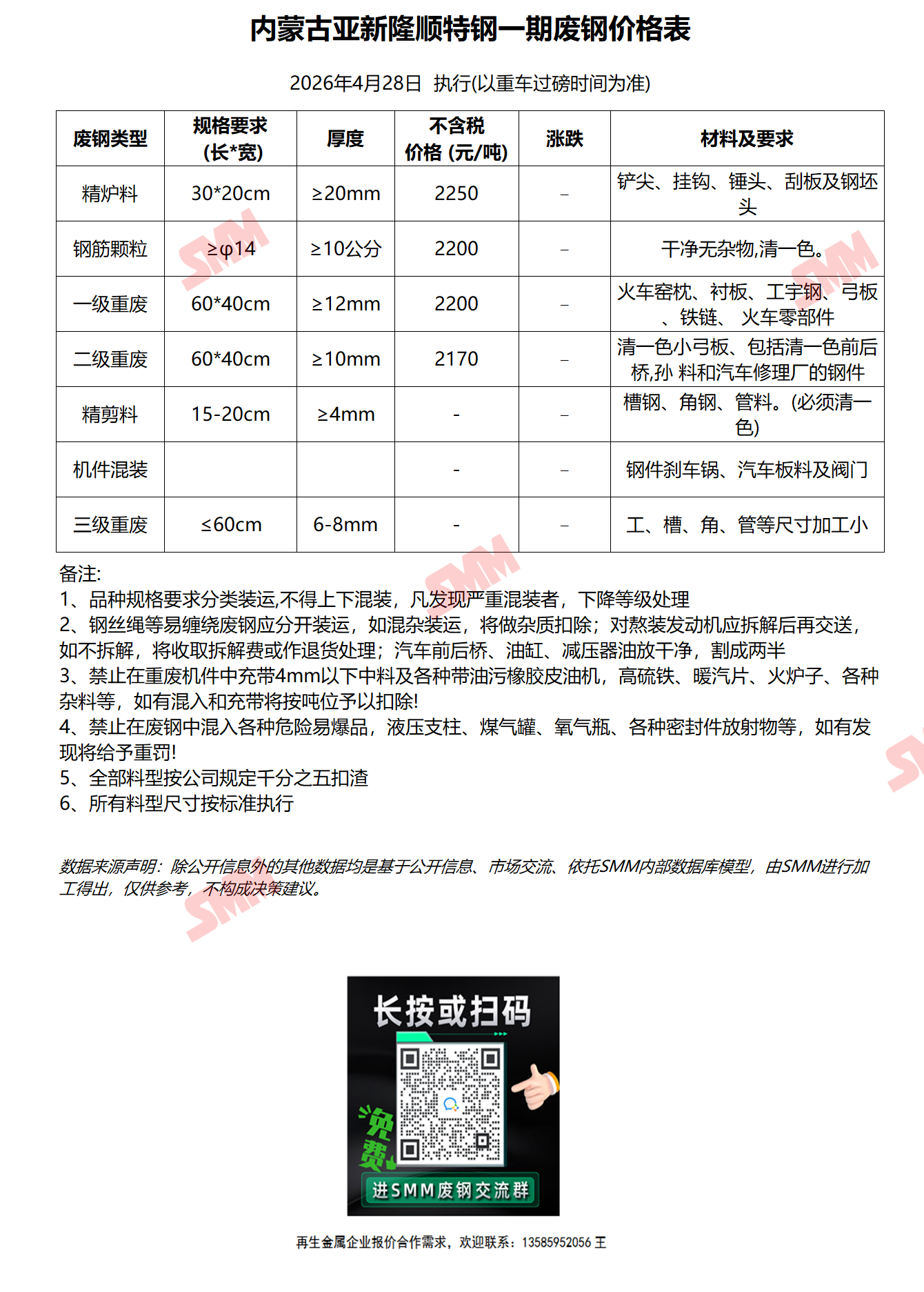 4月28日内蒙古亚新隆顺特钢一期 废钢收购报价