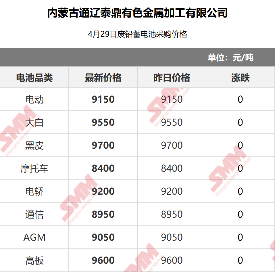 SMM 2026/4/29 国内知名再生铅企业废电瓶采购报价