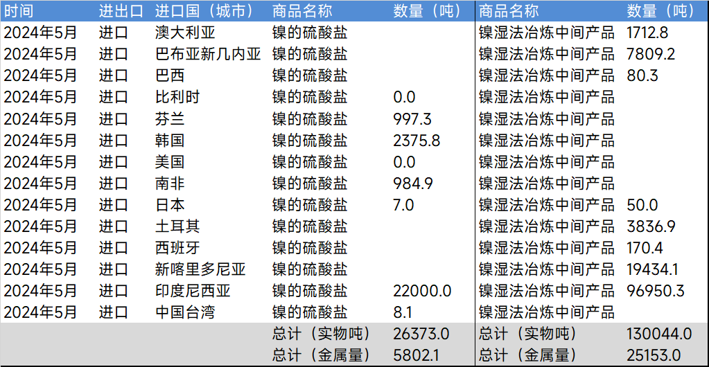 2024年5月镍的硫酸盐及湿法中间品进口-分国别【SMM数据】