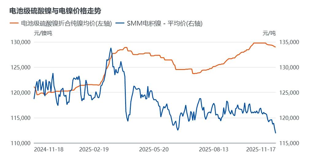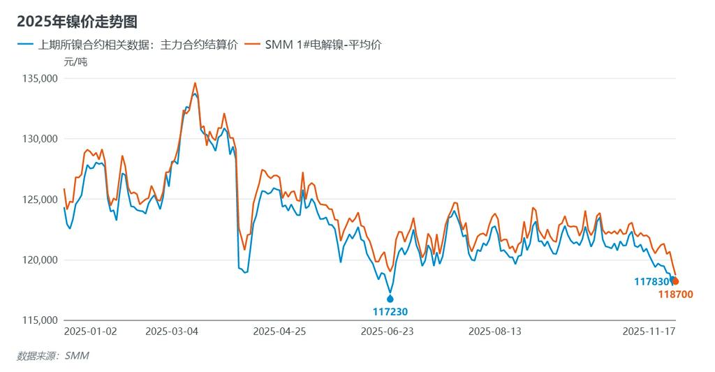 自10月28日起,镍价结束了前期的震荡格局,转入单边下跌通道,价格连续突破多个关键支撑位,市场情绪转向悲观。具体来看,沪镍主力合约从12.1万元/吨一路下跌,至11月17日一度下探至116730元/吨,跌破6月份低点。同期LME镍价也从15335美元/吨跌至14800美元/吨下方,创下阶段性新低。这一轮下跌标志着镍价正式跌破维持近4个月的118000-123000元/吨震荡区间,技术形态呈现明显空头排列,市场重心进一步下移。
