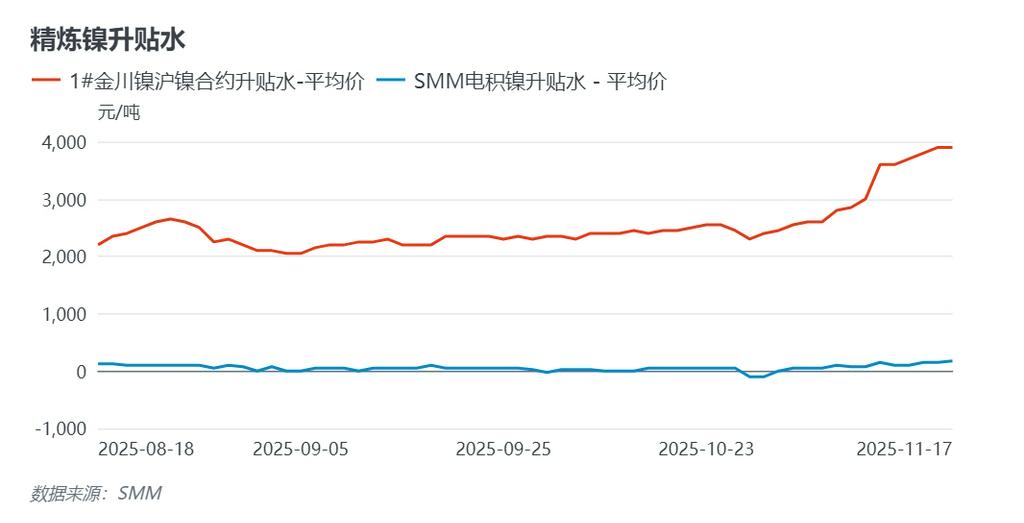 2.精炼镍供需方面,因部分企业转产硫酸镍,11月精炼镍产量存有较大减产预期,且当前生产企业与贸易商挺价意愿较为强烈,进入11月精炼镍升水明显走强,其中金川1#电解镍升水最高达4000元/吨,主流国产电积镍升水同样小幅走高。合金特钢及电镀企业对精炼镍的采购由前期刚下跌时的积极态度,转为镍价连续下跌后的观望态度,等待镍价出现明确底部空间后再进行按需备货。