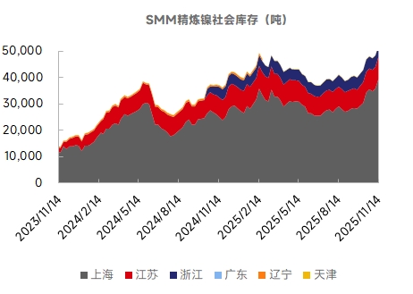 3.库存累积是此次下跌的核心压力源,截至11月17日,LME镍库存达25.2万吨,SMM精炼镍社会库存高达5.3万吨,全球精炼镍库存已超30万吨,创下近5年新高。