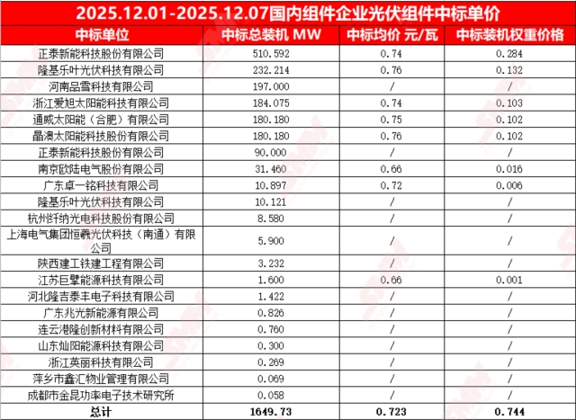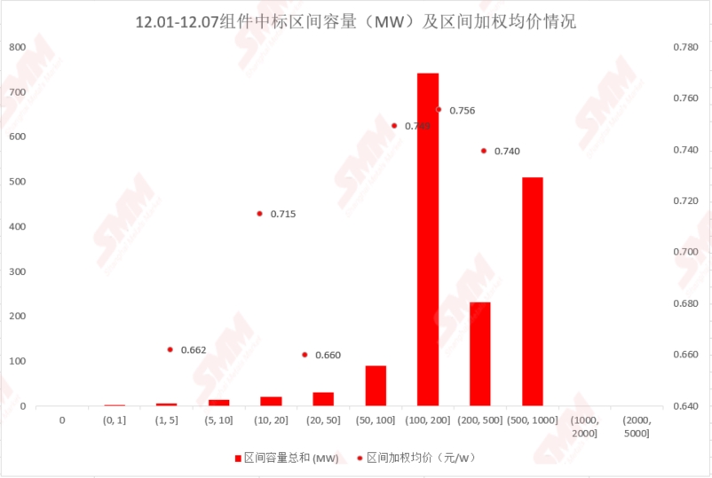 【SMM简报】12.01-12.07光伏组件定标容量1649.73MW,中标均价0.74元/瓦