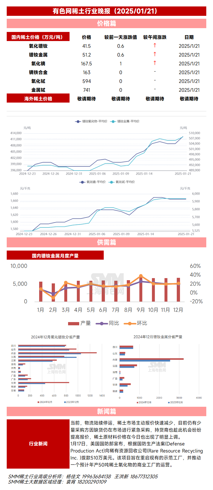 SMM1月21日讯:当前,物流陆续停运,稀土市场主动报价快速减少,目前仍有少量采购方因缺货仍在市场进行紧急采购,持货商也趁此机会纷纷提高报价,稀土原材料价格在今日也出现了明显上调。