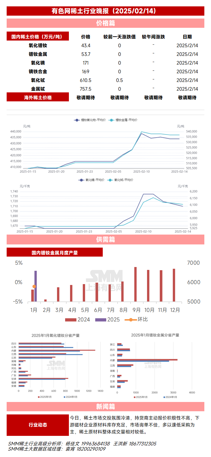 SMM2月14日讯:今日,稀土市场交投氛围冷清,持货商主动报价积极性不高,下游磁材企业原材料库存充足,市场询单不佳,多以逢低采购为主,稀土原材料整体成交量相对较低。