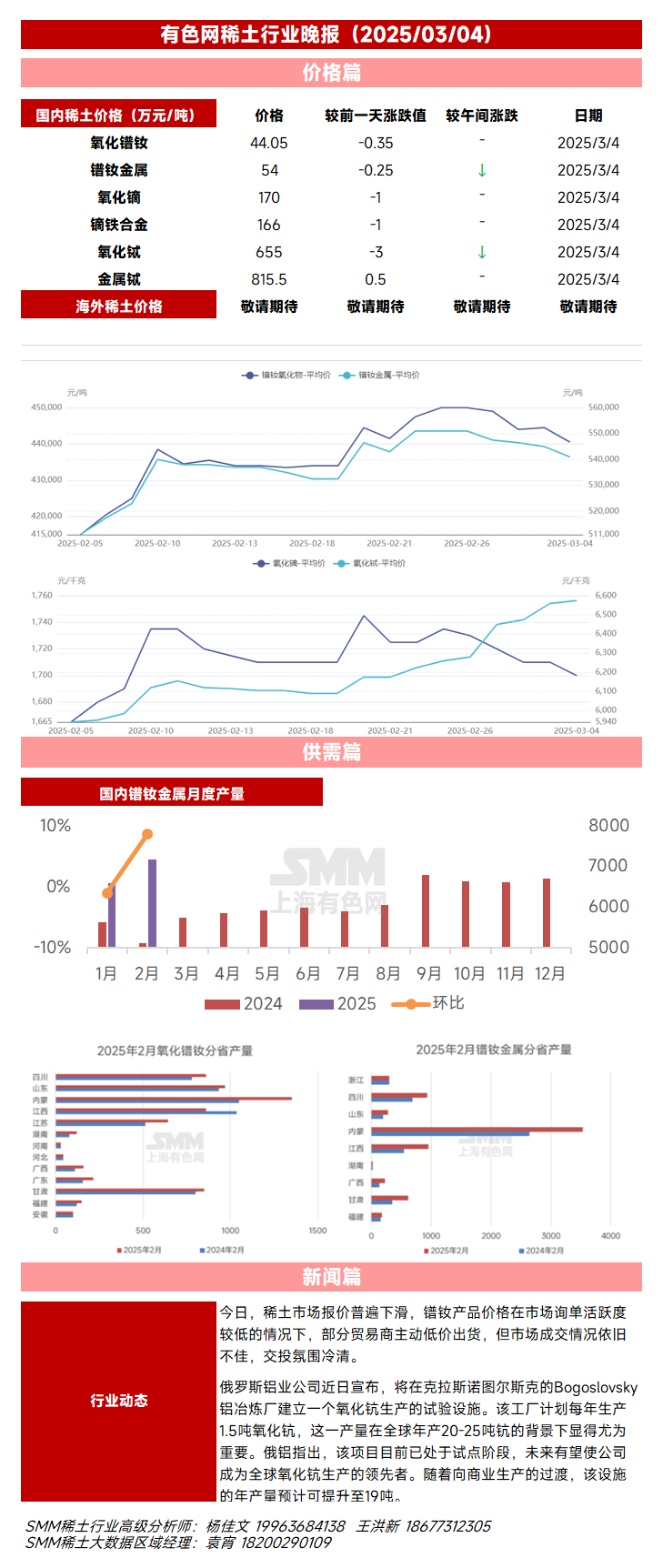 SMM3月4日讯:今日,稀土市场报价普遍下滑,镨钕产品价格在市场询单活跃度较低的情况下,部分贸易商主动低价出货,但市场成交情况依旧不佳,交投氛围冷清。