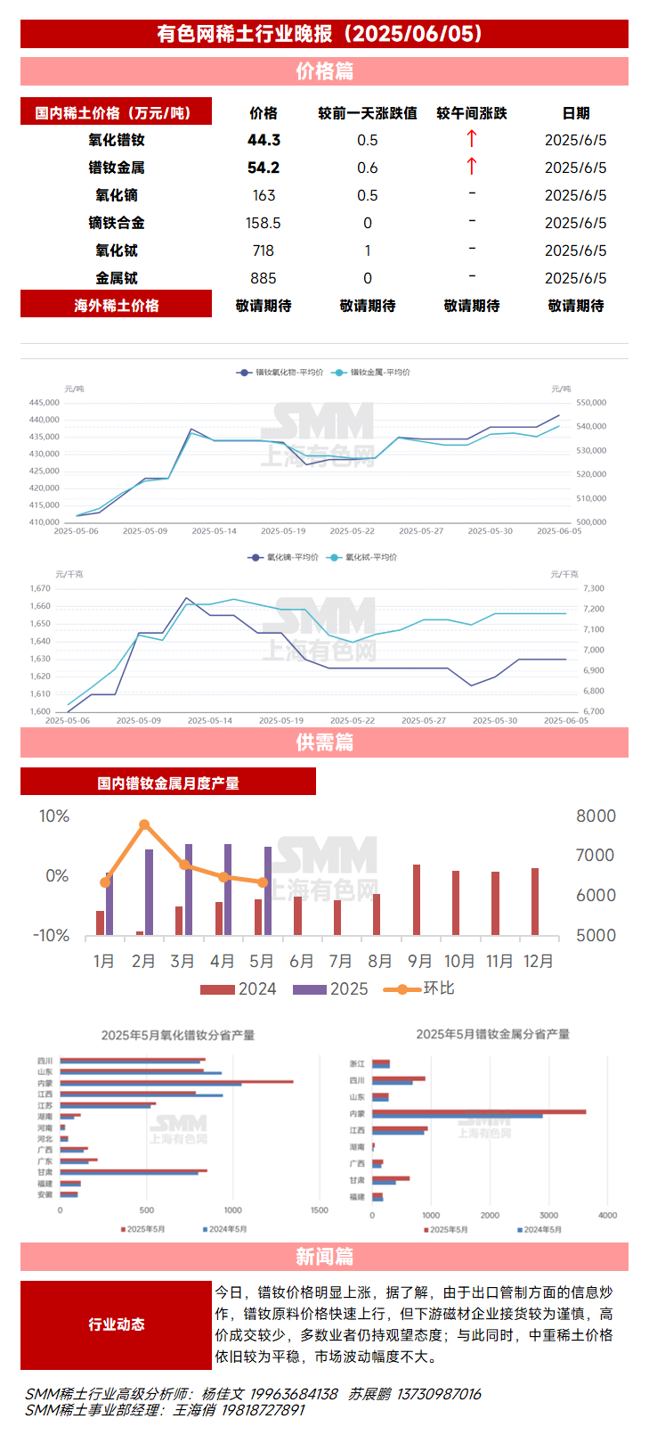 【6月5日SMM稀土市场日报】今日,镨钕价格明显上涨,据了解,由于出口管制方面的信息炒作,镨钕原料价格快速上行,但下游磁材企业接货较为谨慎,高价成交较少,多数业者仍持观望态度;与此同时,中重稀土价格依旧较为平稳,市场波动幅度不大。