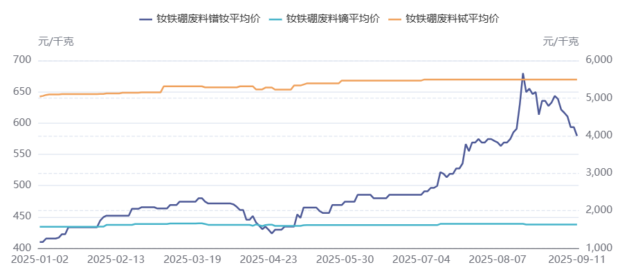 本周,钕铁硼废料镨钕价格报收577-582元/公斤;钕铁硼废料镝价格报收1620-1643元/公斤;钕铁硼废料铽价格报收5439-5550元/公斤;钕铁硼废料钆价格报收89-110元/公斤;钕铁硼废料钬价格报收222-233元/公斤。