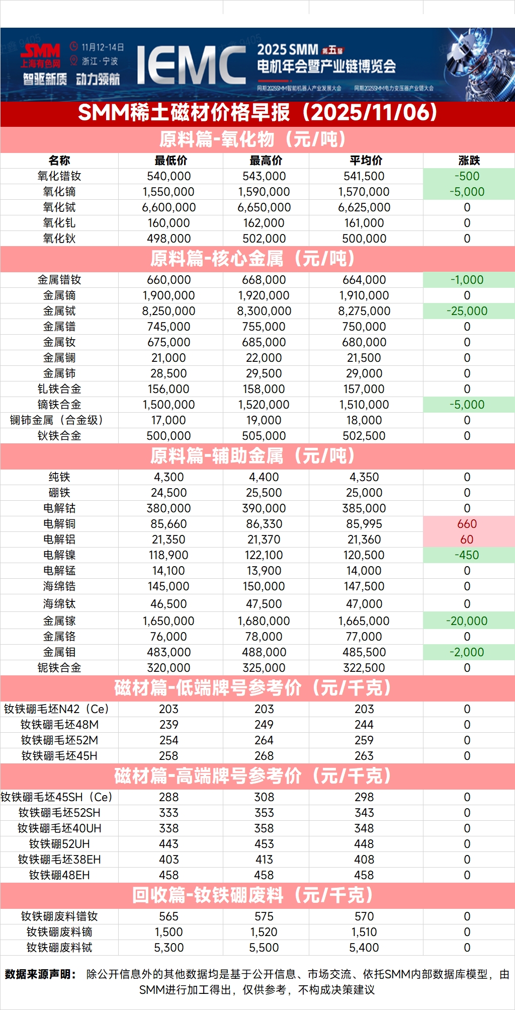 11月6日SMM稀土磁材价格早报,稀土磁材价格早知道!