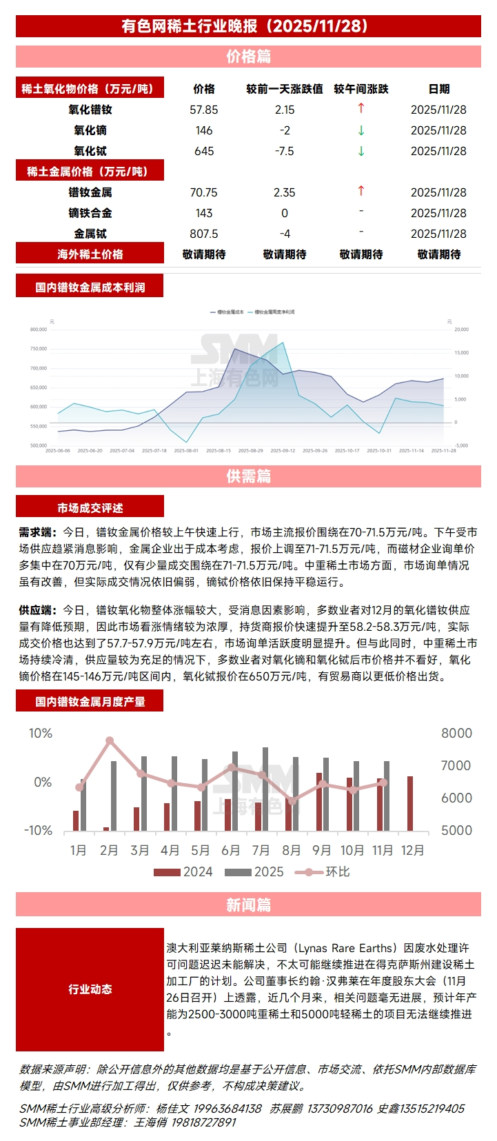 【11月28日SMM稀土行业晚报】今日,镨钕金属价格较上午小幅上调,市场主流报价围绕在68-68.8万元/吨。下午镨钕金属市场询单活跃,实际成交情况表现活跃,低价货源迅速收紧,价格持续上行。市场主流成交围绕在68-68.5万元/吨。中重稀土市场方面,市场询单情况虽有改善,但实际成交并未出现明显改善,镝铽价格依旧保持弱稳运行。