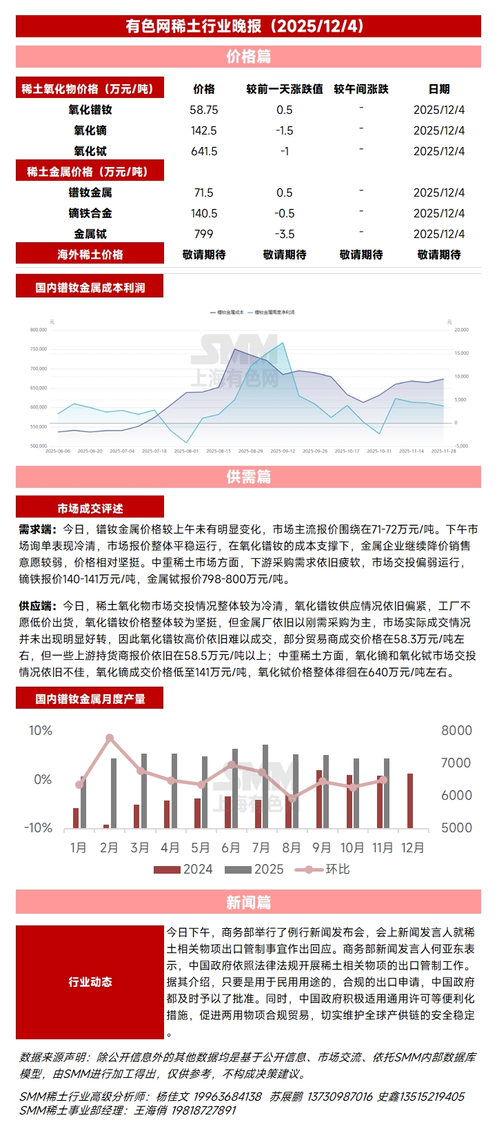 【12月4日SMM稀土行业晚报】今日,镨钕金属价格较上午未有明显变化,市场主流报价围绕在71-72万元/吨。下午市场询单表现冷清,市场报价整体平稳运行,在氧化镨钕的成本支撑下,金属企业继续降价销售意愿较弱,价格相对坚挺。中重稀土市场方面,下游采购需求依旧疲软,市场交投偏弱运行,镝铁报价140-141万元/吨,金属铽报价798-800万元/吨。