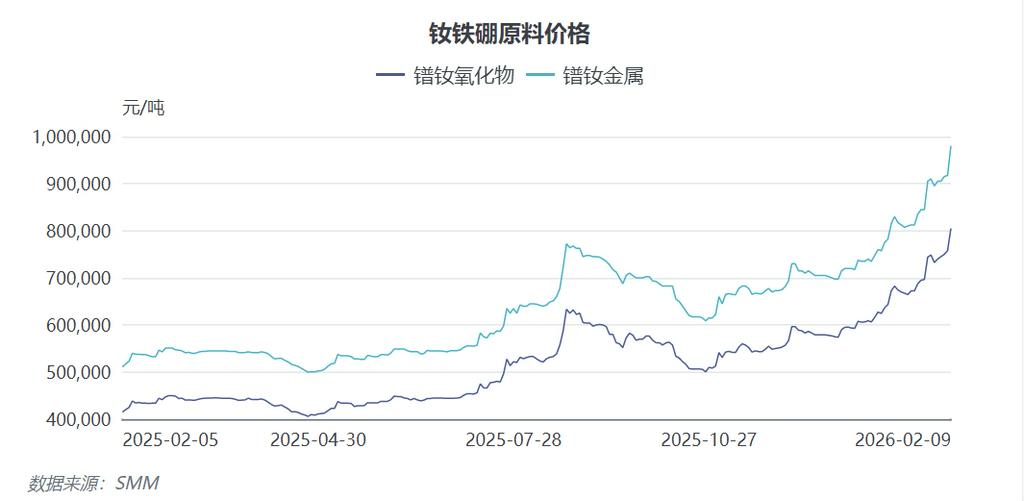 “这个市场太疯狂了”。这是当前许多磁材厂和电机厂负责人的共同感受。截至2026年2月9日,镨钕金属报价已达到975000-985000元/吨,单日涨幅高达7%,环比上周涨幅9.4%,相较于去年同期涨幅超过88%。稀土产业链的中下游企业正面临严峻考验。在稀土价格比较平稳的时期,整车厂习惯于和磁材厂以季度锁价的方式签单,这一模式在2023-2025年上半年周期中颇为常见。然而,从2025年下半年开始,稀土价格出现剧烈变化,主要表现为大起大落,导致磁钢厂逐渐难以接受季度锁价模式。