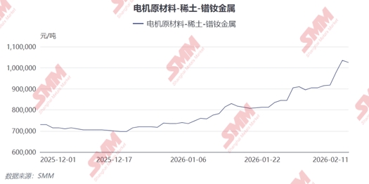 稀土市场价格持续走高,已经形成一股不可忽视的浪潮。截至2月9日,镨钕金属价格达97.5-98.5万元/吨,年初至今涨幅达33.1%。这一涨势超出了许多市场参与者的预期。这一趋势在进入2026年后不仅没有减弱,反而呈现加速态势。价格飙升的背后存在多重因素。稀土环节供应端增量有限,上游生产企业开工走弱,且部分企业长协订单交付,市场可流通现货数量不多。年底上游出货意愿不强,整体供应端紧张状况加剧。同时,需求端整体表现尚可,下游磁材企业虽然国内订单一般,但海外订单向好,开工率整体稳中有进,新能源车,电动二轮车等领域2026年市场增量预期仍存。这些因素共同推动了稀土价格的持续上涨。