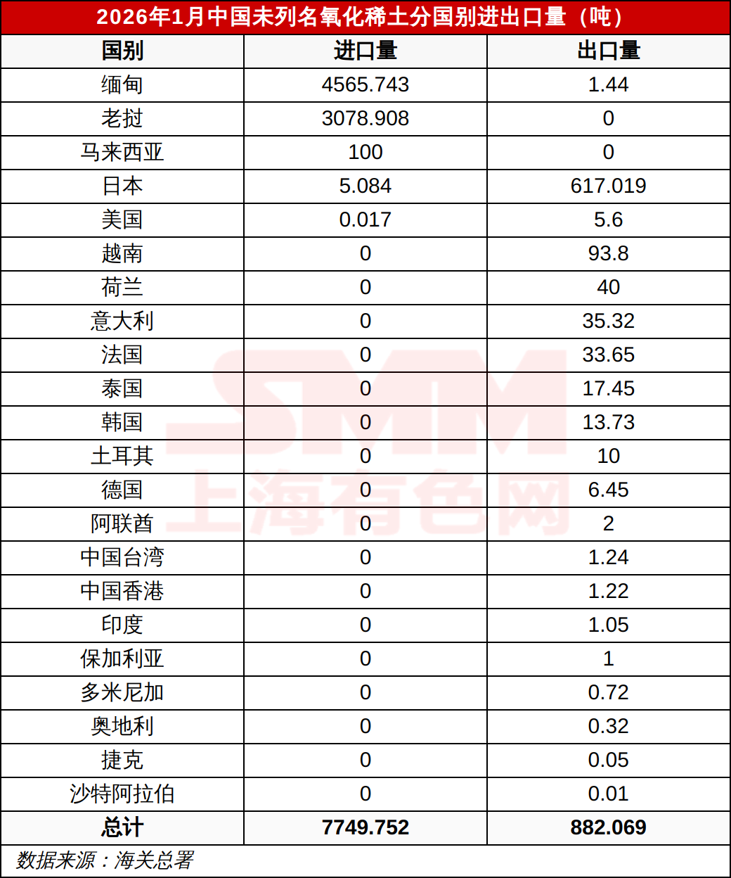 2026年1月中国未列名氧化稀土分国别进出口量