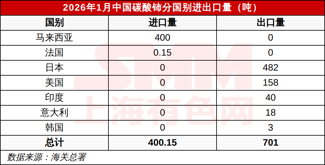 2026年1月中国碳酸铈分国别进出口量