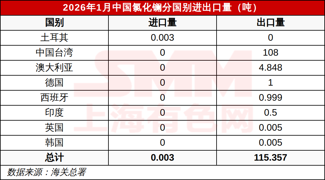 2026年1月中国氯化镧分国别进出口量