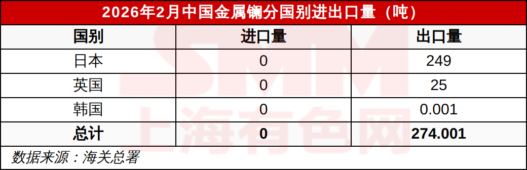 2026年2月中国金属镧分国别进出口量