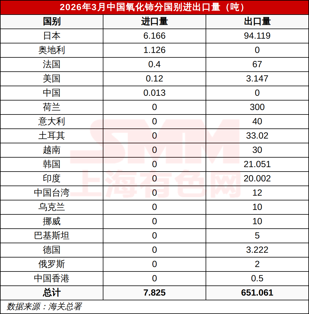 2026年3月中国氧化铈分国别进出口量