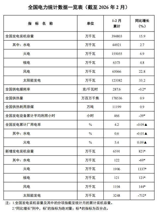 国家能源局:2月底全国发电装机增15.9%3月25日,国家能源局发布2026年1-2月份全国电力统计数据。截至2月底,全国累计发电装机容量39.5亿千瓦,同比增长15.9%。其中,太阳能发电装机容量12.3亿千瓦,同比增长33.2%;风电装机容量6.5亿千瓦,同比增长22.8%。