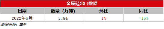 海关数据显示,2022年6月中国金属硅出口量为5.84万吨,环比微增1%同比减少16%。