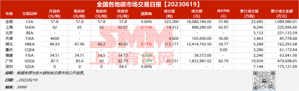 全国各地碳市场交易日报20230619【碳排放交易日报】