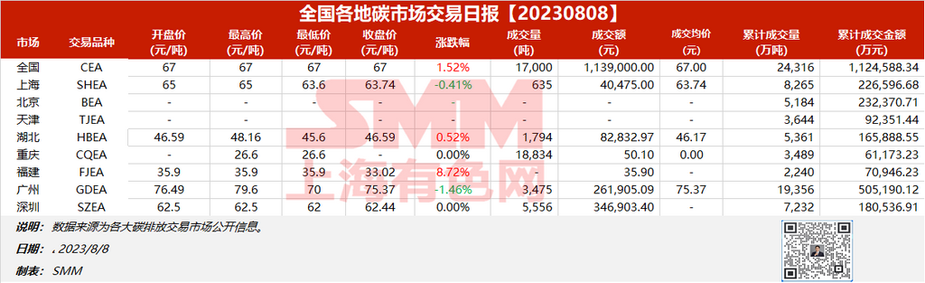 全国各地碳市场交易日报20230808【碳排放交易日报】