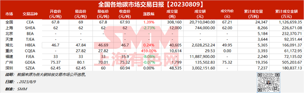 全国各地碳市场交易日报20230809【碳排放交易日报】