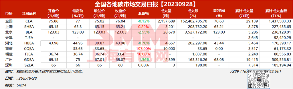 全国各地碳市场交易日报20230928【碳排放交易日报】