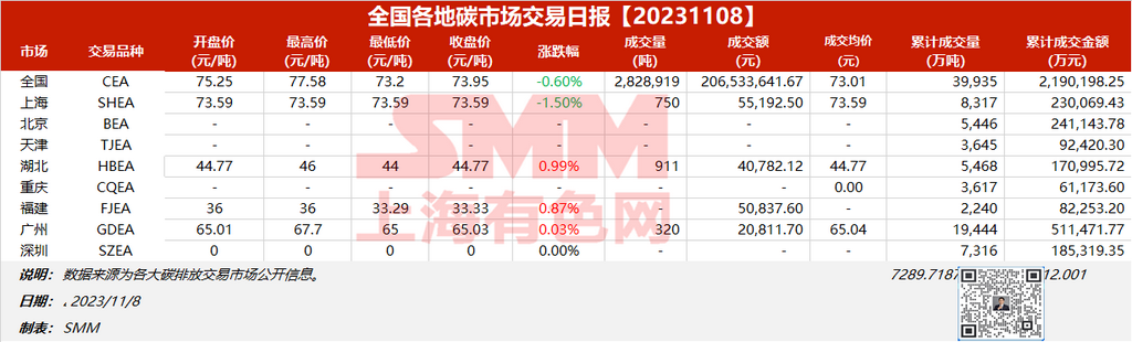 全国各地碳市场交易日报20231108【碳排放交易日报】