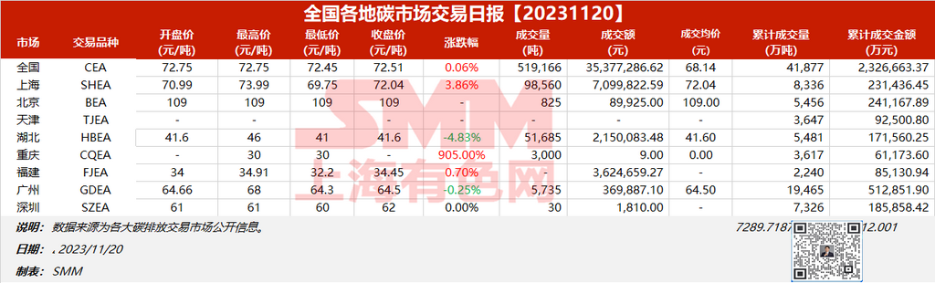 全国各地碳市场交易日报20231120【碳排放交易日报】