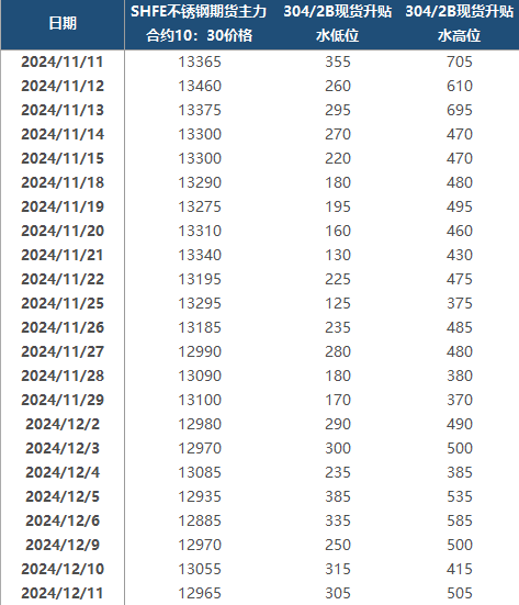 12月12日,不锈钢期货翻红,但现货市场缺乏信心,价格跟涨力度较小。整体出货情况较为平稳,市场对于原料端价格较为关注,对后续原料成本以及不锈钢价格下跌担忧浓厚,预计短期内现货价格偏稳运行。当日早间304冷轧无锡地区报13150-13300元/吨,304热轧无锡地区报12550-12650元/吨。316L冷轧无锡地区报24000-24200元/吨。201J1冷轧无锡地区报7450-7850元/吨。430冷轧无锡地区报7350-7550元/吨。SHFE10:30分SS2501合约价格13055元/吨,无锡不锈钢现货升水315-415元/吨。(现货切边=毛边+170元/吨)。