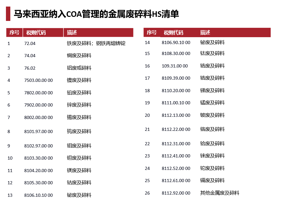 - 2024 年 5 月|扩围:需 COA (合格证)的 HS 代码由 3 个增至 26 个,将废镍/铅/锌/锡等纳入;票据与实货一致性审查显著收紧。
