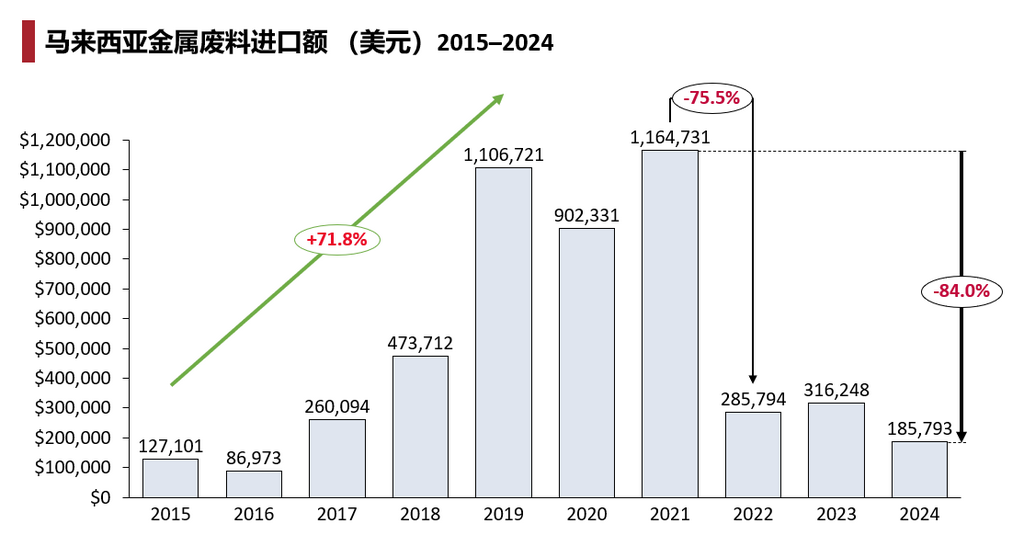 图表显示,2017 到 2021 年,马来西亚废金属进口一路走高,2021 年冲到历史峰值。转折发生在 2022 年,正好赶上 COA 和检验制度全面收紧,进口额从 116 万以上瞬间摔到不足 29 万,跌幅超过 75%。此后一直在低位徘徊。我们可以看到,监管强度正在主导市场规模,“高门槛、重合规”已经成为新的常态。