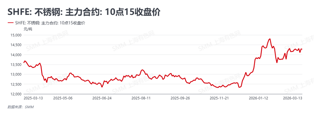 SMM数据显示,本周(2026年3月9日-3月13日)进入“金三”传统消费旺季的中场阶段,不锈钢主力合约已平稳移仓至SS2605。在海外地缘风暴升级与国内去库拐点显现的交织下,期价呈现高位震荡运行。截至3月13日10:15收盘,合约报价上行至14275元/吨,较上周五主力收盘价微涨40元/吨。本周市场的核心矛盾高度集中于“供给放量与需求弱复苏的错配”,尽管基本面未现火热景象,但在地缘溢价与原料成本的强力托底下,盘面下方支撑极为坚实,未能形成趋势性下跌。