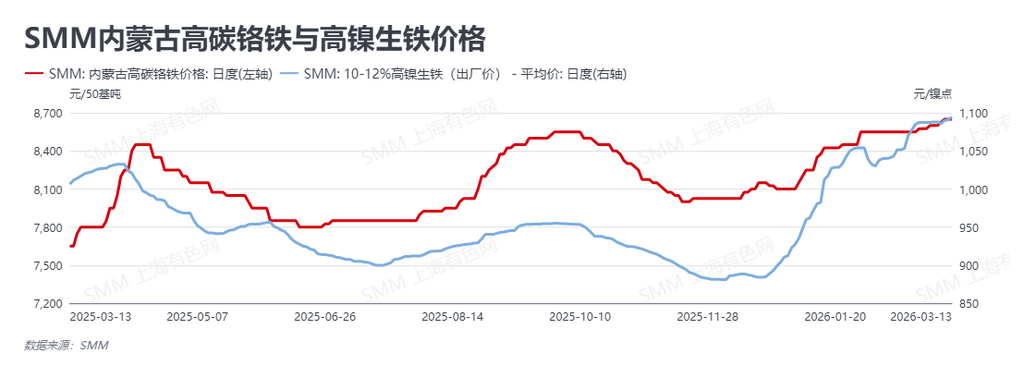 成本端延续强势上攻态势,成为现阶段抗跌的核心支柱。受地缘政治及印尼矿端供应偏紧的持续发酵影响,原料报价节节攀升。截至3月13日,高镍生铁(NPI)报价继续上探至1094.5元/镍点,较上周上涨6.5元;高碳铬铁亦同步跟涨至8650元/50基吨。在原料成本的不断推升下,钢厂生产成本线持续上移,尽管下游对高价资源的接受度有限,但在成本高企甚至倒挂的硬性约束下,让利出货的空间被极大压缩,成本端对期现价格的底部支撑力气愈发强劲。