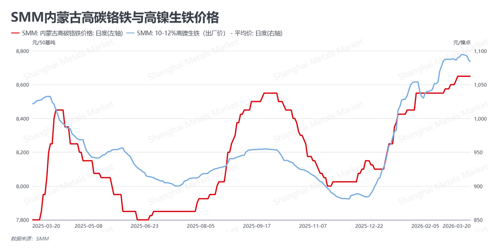 成本端亦呈现高位松动迹象。截至3月20日,高镍生铁报价结束了前期的单边上扬,小幅回落至1084元/镍点;高碳铬铁价格则持稳于8650元/50基吨。随着盘面价格的回调以及钢厂对高价原料采购的持续谨慎,NPI向上突破1100元关口遇阻。原料价格的高位企稳与小幅让利,使得钢厂的成本重心上移压力得到阶段性缓解,前期强劲的“成本驱动”逻辑暂告一段落。