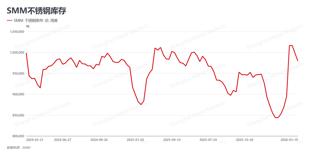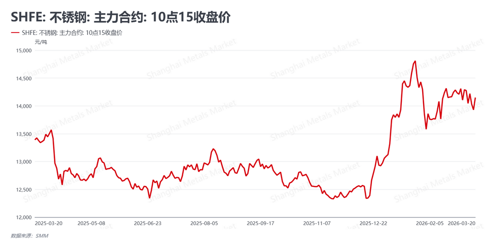SMM数据显示,本周(2026年3月16日-3月20日)进入“金三”传统消费旺季的下半场,不锈钢主力合约(SS2605)在宏观承压与现实需求偏弱的双重作用下,呈现高位回落走势。截至3月20日10:15收盘,合约报价回撤至14150元/吨,较上周五收盘价14275元/吨下跌125元/吨。本周市场的核心特征在于前期支撑盘面的利多因素边际减弱:海外宏观释放偏鹰信号,原料端上行动能暂缓,而旺季终端需求的实质性复苏力度依然欠佳,导致期价在上行受阻后理性回调。