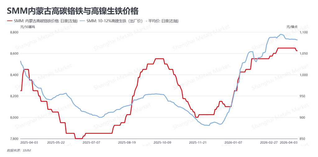 成本端支撑力度继续转弱,产业链利润分配博弈加剧。截至4月10日,高镍生铁(NPI)报价阴跌至1080元/镍点,高碳铬铁价格亦回落至8550元/50基吨。受不锈钢现货跟涨乏力影响,钢厂生产利润长期处于倒挂边缘,对原料端压价意愿极强。尽管镍矿端价格依然坚挺,但随着下游需求的温吞,原料价格重心被迫下移。这种“成本下行+价格修复”的局面虽暂时缓解了钢厂的亏损压力,但也削弱了不锈钢价格下行的底部防御能力。
