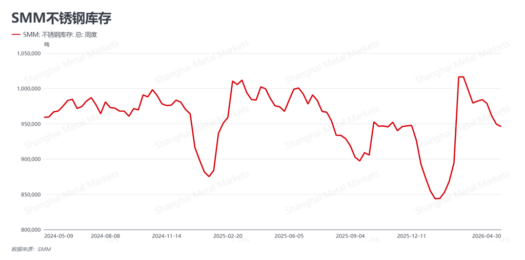 从基本面来看,期现走势呈现分化,节前备货不及预期。SMM最新数据显示,本周社会库存小幅回落至 94.59 万吨,较上周下降 0.35 万吨。库存虽维持降势,但现货市场实际成交偏弱。由于期货盘面上涨较快,现货跟涨与不锈钢自身供需基本面关联较弱,导致下游终端观望情绪较浓。除周初有少量集中成交外,后续成交转弱,开平分条等加工厂生意整体平淡,终端未现明显的“五一”节前备货迹象。当前的现货流动性主要靠期现套利机构支撑,真实需求尚难完全匹配盘面的涨幅。
