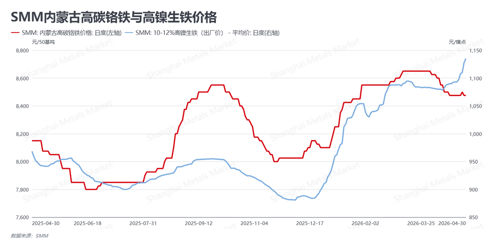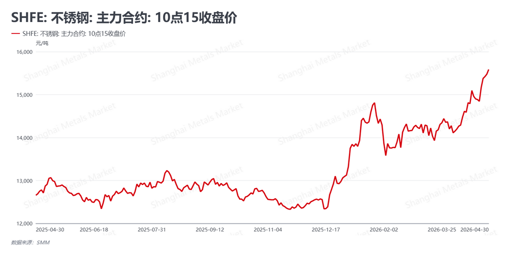 SMM数据显示,本周(2026年4月27日-4月30日)作为“五一”小长假前的最后交易周,不锈钢主力合约(SS2606)呈现明显偏强走势,创下2023年以来的阶段性新高。截至4月30日收盘,主力合约报收于 15585 元/吨,较上周五上涨 420 元/吨。本周市场的核心驱动力主要来自“原料端突发扰动与成本中枢的显著抬升”,资金在此预期下推动盘面进一步上探。