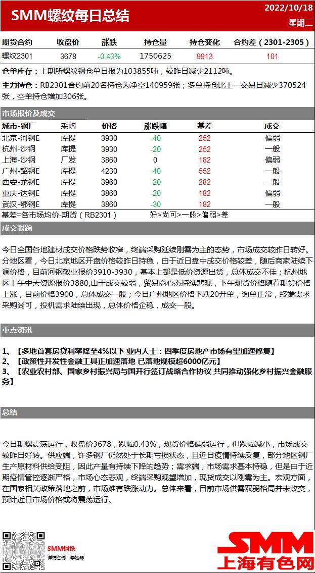 【SMM螺纹日评:螺纹期现震荡运行 市场成交小幅转好】今日期螺震荡运行,收盘价3678,跌幅0.43%,现货价格偏弱运行,但跌幅减小,市场成交较昨日好转。