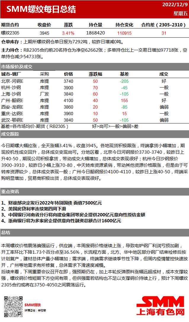 【SMM螺纹日评:期螺强势拉涨 本轮反弹还能持续多久?】今日期螺大幅拉涨,全天涨幅3.41%,收盘3945。各地现货积极跟涨,终端拿货小幅增加,期现投机性成交回升,总体成交变现尚可。