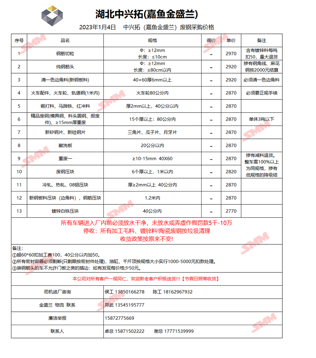1月4日湖北中兴拓(嘉鱼金盛兰) 废钢采购报价