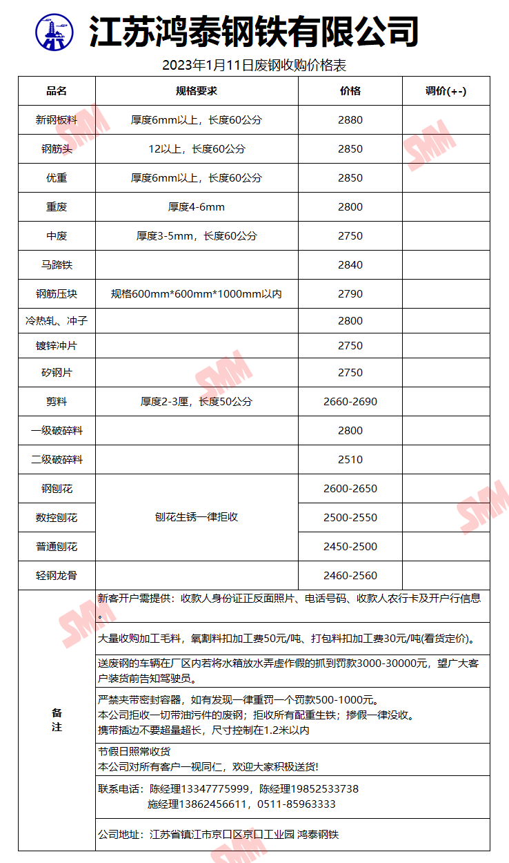 1月11日江苏鸿泰钢铁 废钢收购报价