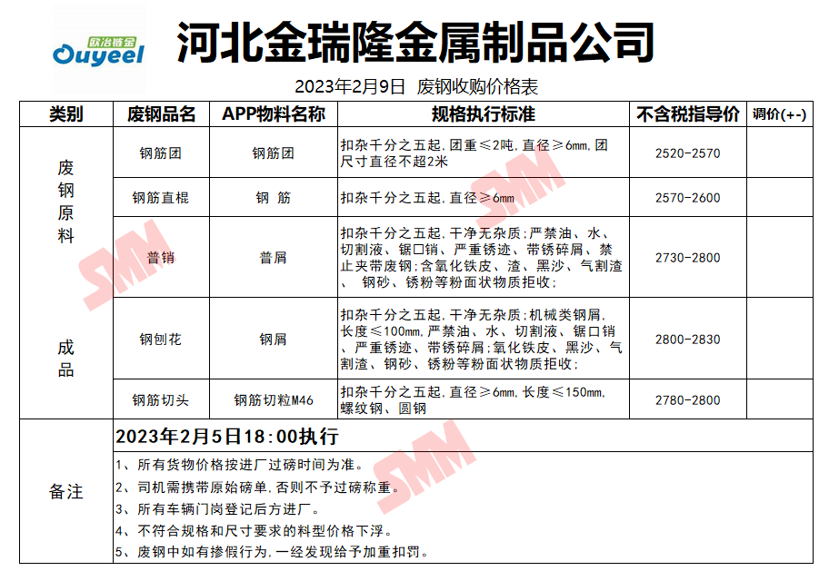 2月9日河北金瑞隆钢铁 废钢收购报价