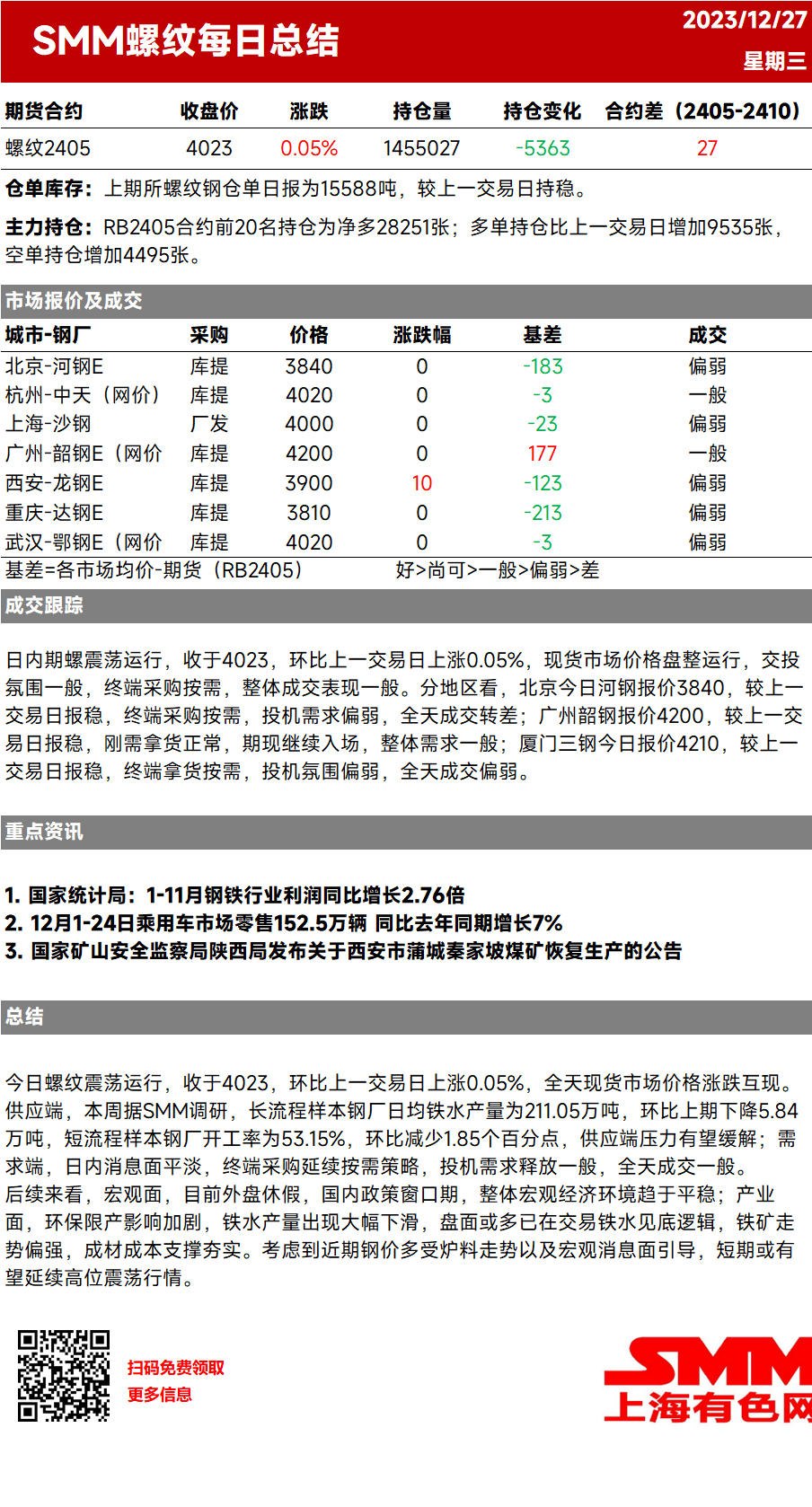 【SMM螺纹日评:期螺高位震荡 交投氛围一般】日内期螺震荡运行,收于4023,环比上一交易日上涨0.05%,现货市场价格盘整运行,交投氛围一般,终端采购按需,整体成交表现一般.....