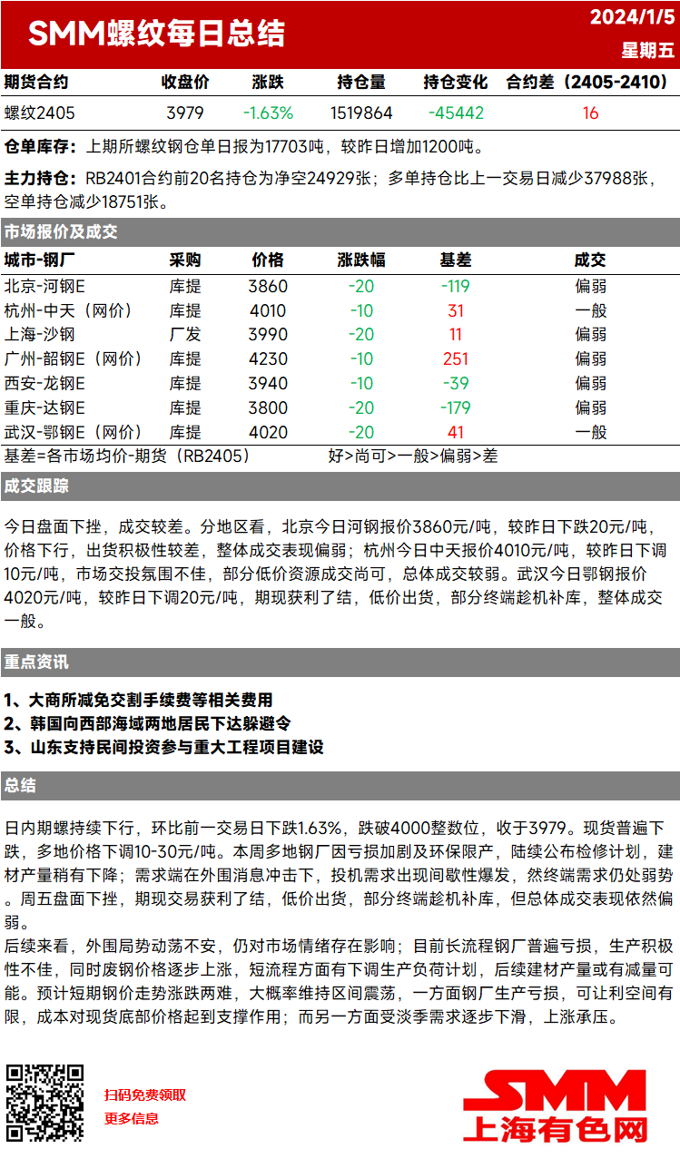 【SMM螺纹日评:成材盘面大幅下挫 期现获利了结】日内期螺持续下行,环比前一交易日下跌1.63%,跌破4000整数位,收于3979。现货普遍下跌,多地价格下调10-30元/吨······