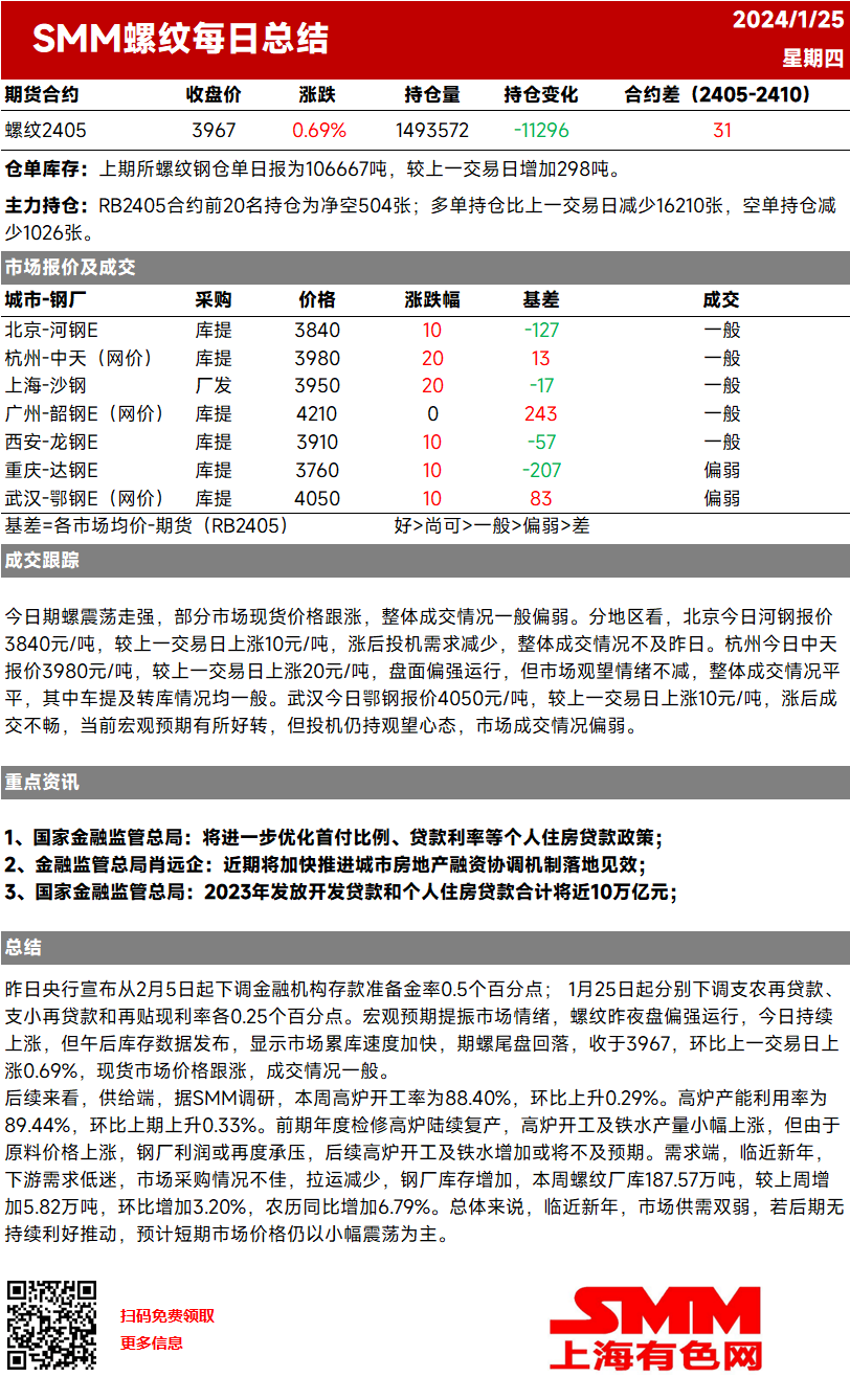 【SMM螺纹日评:市场持续累库 期螺尾盘回落】昨日央行宣布从2月5日起下调金融机构存款准备金率0.5个百分点; 1月25日起分别下调支农再贷款、支小再贷款和再贴现利率各0.25个百分点。宏观预期提振市场情绪,螺纹昨夜盘偏强运行,今日持续上涨...